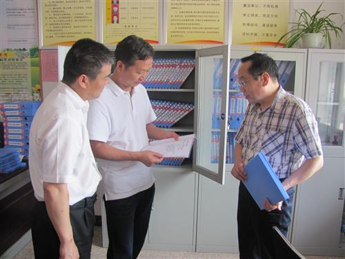 张宗福主任(中)与淮滨县领导(左)、县编办李主任在宋营村查看扶贫档案